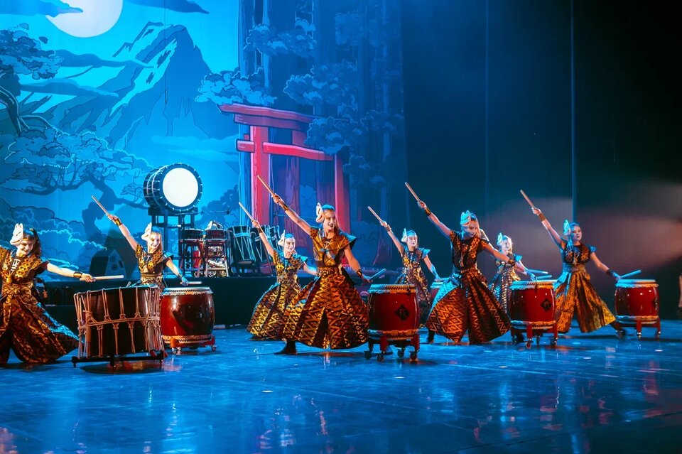 Постановка представляет собой первый музыкальный спектакль, в котором история большой любви рассказывается языком барабанов тайко и других японских музыкальных инструментов. «Море синего леса» отсылает к древнему японскому празднику — ночь любования полной луной Цукими Мацури. Специально для него была придумана красивая легенда, которая оригинально переосмысливается в спектакле. «Море синего леса» — уникальная для России постановка, где все перипетии сюжета переданы посредством ритма японских барабанов, которые используются также в качестве инновационных декораций. В спектакле также можно услышать живые партии щипкового инструмента кото, флейт сякухати и синобуэ и этническую песню, служащую сигналом к выходу демонов. Постановка завораживает даже самого искушённого зрителя своими уникальными аутентичными костюмами и разнообразием реквизита. Действие постановки происходит у подножия горы Фудзи на месте нынешнего города Киото, где в легендарные времена обитали духи и мифологические животные. В эпицентре их борьбы и оказался доблестный воин Гецу Оомори, влюблённый в волшебную лисицу кицунэ, которая охотится за персиком бессмертия. Изначально задуманный как романтический спектакль, «Море синего леса» трансформировался в итоге в романтическую драму о любви и самопожертвовании. Показы «Моря синего леса», проходившие ранее всегда сопровождались аншлагом. Публика по достоинству оценила возможность полного погружения в самобытную японскую культуру, органику профессиональных актёров и музыку, сочинённую знаменитым японским барабанщиком Такуя Танигути. Эмоциональное представление всецело овладевает вниманием зрителей, побуждая их бурно аплодировать не только в финале спектакля, но и на всём его протяжении после многочисленных наиболее насыщенных мизансцен.